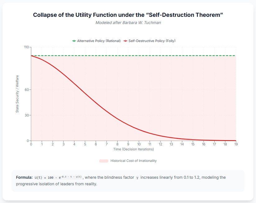 Barbara W. Tuchman, in her book The March of the Folly, defines irrational decision-making at the state level through three strict criteria: acting against self-interest, rejecting a viable alternative, and ignoring clear contemporary warnings.