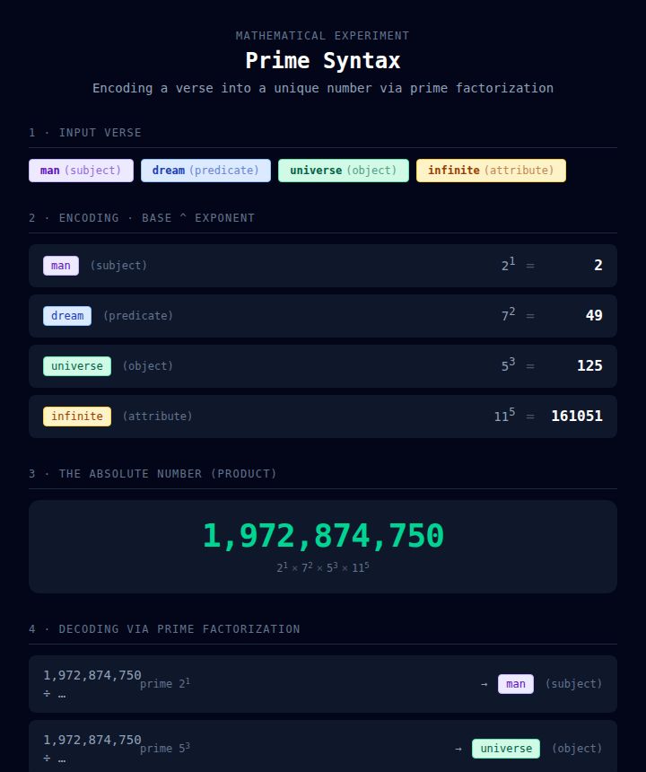 The following Python script validates the theoretical mechanics of Prime Syntax. The algorithm functions as a bidirectional decoder. It transforms a sentence into its absolute number and uses the Fundamental Theorem of Arithmetic to extract the poem back from the number. See the code below verified in Replit.